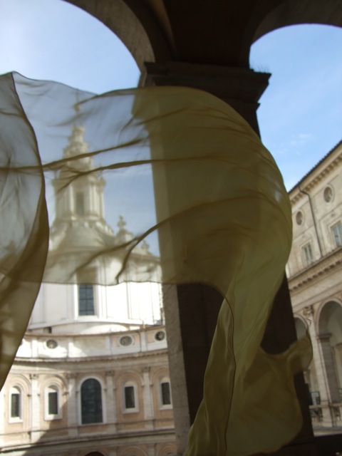 Borromini’s unique invention of architectural language became the perfect foil for the sublimated sexual energy of the ephemeral silks. The gauze veiled and revealed details of his buildings, suggesting a human presence by evoking fleeting figures.