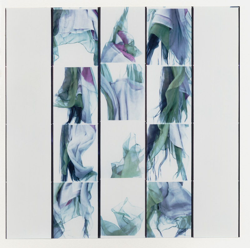 Drapes, veils and translucent sheer fabrics caught in motion. Images caught in performing sequence, collaged together sequentially to suggest action. When photography was developed in the nineteenth century, the conventional background curtains that were de rigeur in traditional painted portraits, were transferred to the photographic portrait. No surprise that they survived and became a constant within the photobooth. Rideal wanted to suppress the static curtain and liberate the material, get it to fly and misbehave. Give it a life of its own as an abstract object that suggested a painted sublimated emotional experience caught within the strictures of a minimal grid.