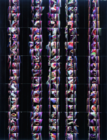Early on Ms Rideal departed from the conventional photo booth portrait Works from 1996 to 1998, on show here, focus on colored fabrics that the artist manipulates before the cameras’s unwavering eye, producing a kind of photographic update of Color Field painting. In the best works here, she collages hundreds of the four-shot strips into large grids. Up close in “Arras Suite Red” you can see each little picture shows a slightly crumpled expanse of red cloth. From a distance, more than 800 little red squares coalesce into a lush, vibrating field.