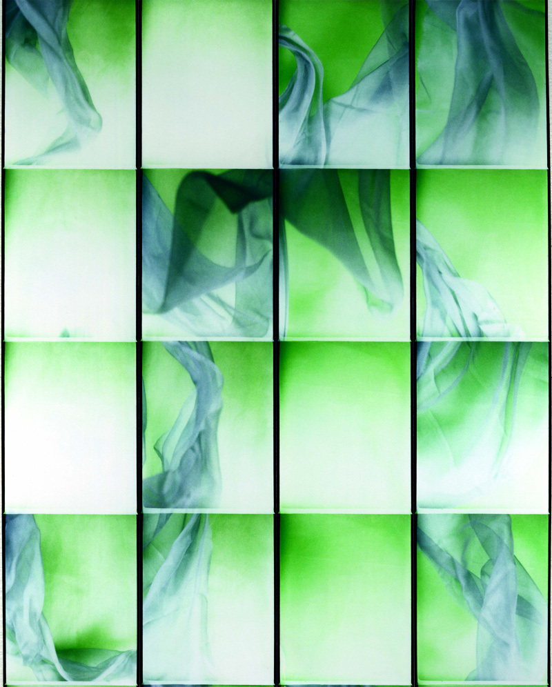 Drapes, veils and translucent sheer fabrics caught in motion. Images caught in performing sequence, collaged together sequentially to suggest action. When photography was developed in the nineteenth century, the conventional background curtains that were de rigeur in traditional painted portraits, were transferred to the photographic portrait. No surprise that they survived and became a constant within the photobooth. Rideal wanted to suppress the static curtain and liberate the material, get it to fly and misbehave. Give it a life of its own as an abstract object that suggested a painted sublimated emotional experience caught within the strictures of a minimal grid.
