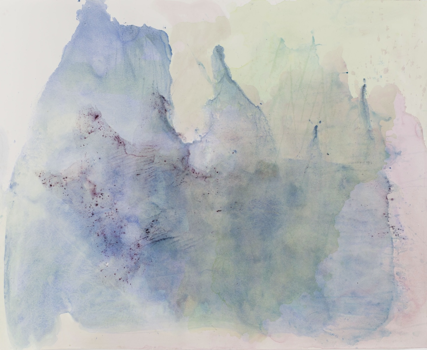 Rideal’s images juggle the unpredictability of paint in the manner of Frankenthaler, exploring the delicate medium of watercolour on a large surface, coupled with the chance results of decalcomania*. Intuitive manipulation, mixing and layering of colour into wet or dry surfaces offer surprising combinations and effects. In another type of symmetry, two watercolours are rendered in transparent silk, one viewed at the relative distance between the gallery window and its back wall, the second suspended with a small space between silk print and watercolour. This installation references the focal length of the camera eye and furthers the analogy with translucent layering.