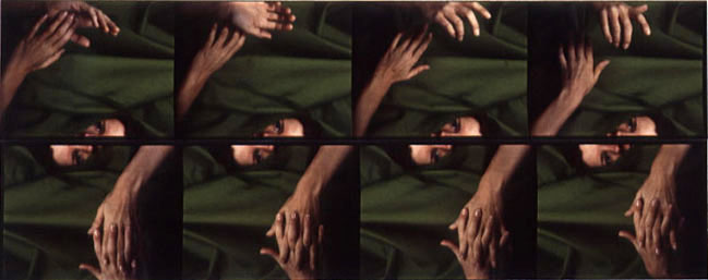 In Blue Cascade (1997), swathes of brightly coloured tulle are grasped against a background of kingfisher blue silk. The matchbox sized images are repeated again and again, each time with a different variation, creating a feeling of movement, as if each shot charted the motion of a flickering flame. The fabric appears to dance of its own accord, spinning into incredible folds and curves. in some shots, the artists hand is Court manipulating the fabric, like the hand of a puppet master, controlling the image from within.
