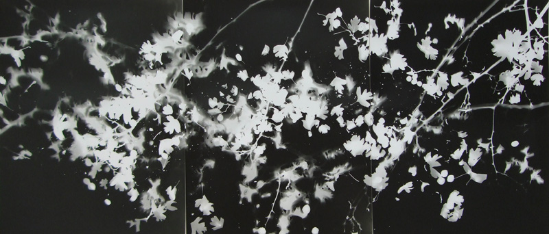 Rideal used branches and berries taken from an old hawthorn tree located close to the new cancer centre (at: 454308E – 205690N, etched into the mirror at the base of panel four) and made life size photograms from them. Research suggests that phyto-chemicals found in hawthorn, may reduce the risk of cancer.These images were then scanned making a vinyl mask to create a design that is itself reflective while also echoing the pattern produced by the repeated photograms.