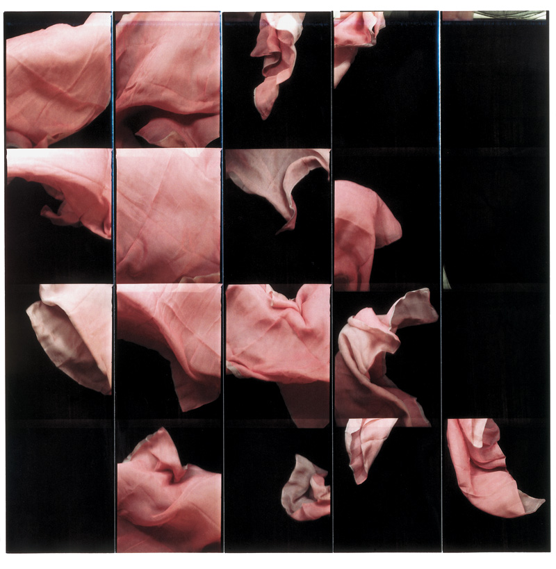 Early on Ms Rideal departed from the conventional photo booth portrait Works from 1996 to 1998, on show here, focus on colored fabrics that the artist manipulates before the cameras’s unwavering eye, producing a kind of photographic update of Color Field painting. In the best works here, she collages hundreds of the four-shot strips into large grids. Up close in “Arras Suite Red” you can see each little picture shows a slightly crumpled expanse of red cloth. From a distance, more than 800 little red squares coalesce into a lush, vibrating field.