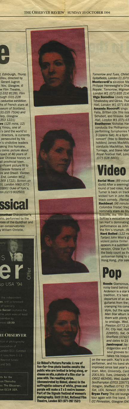 Between 1985 – 1994, Rideal created five 2×5 metre works using photobooth images donated by the general public. Identity, Tartan Castle, People Profile – Pillars of Society, Corner(house) and Picture Parade. These and other photobooth works were exhibited at: