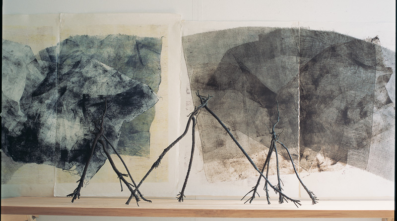 Mandrake Tango bronzes installed with Auroras of Autumn monotypes. Anthropomorphic bronzes against ‘backcloth’ of tarlatan prints.