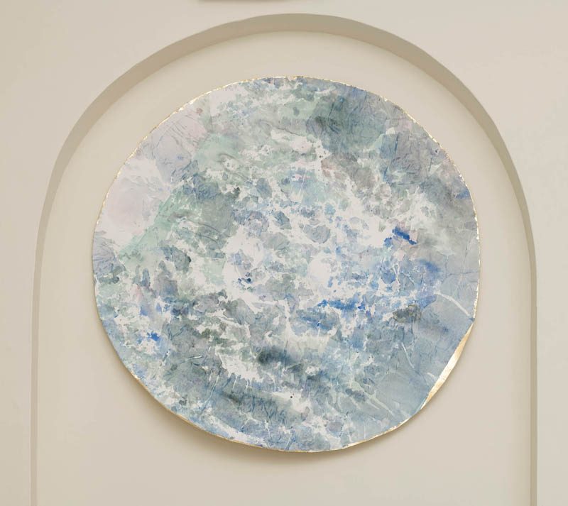 The frottage watercolour drawings Medallion (Pontine), Medallion (Seagrass), and Etruscan Shield (Verdigris) similarly create and subvert the illusion of movement. The rubbings of the Cosmatesque floors may start as copies of patterns in wax and pastel on Japanese paper; however, by purposefully moving the paper during the process, a fleeting quality is created.